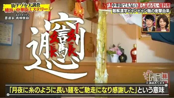 由来には諸説あるそうだが、「ビャンビャンメン」を初めて食べた人が、「月夜に糸のように長い麺をご馳走になり、感謝した」などの思いを1文字で表して「ビャン」の音に当てたため、こんなに難しい字になったと言われている。