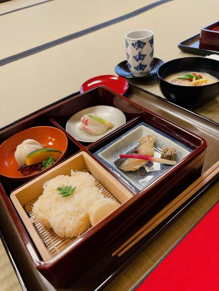 そして「凛とした空気の中でいただく一服と、心のこもったお料理。 新しい年のはじまりを静かに味わう豊かな時間でした。」と続け、白身魚や薄い黄色に色づいたご飯などが盛り付けられた懐石料理のショットを公開。春の訪れを感じさせるお料理は、食欲がそそられ、とてもおいしそうですね。