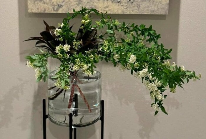 鮮やかな緑色の葉が多く生え、長く伸びている茎が、垂れ下がるように生けられています。