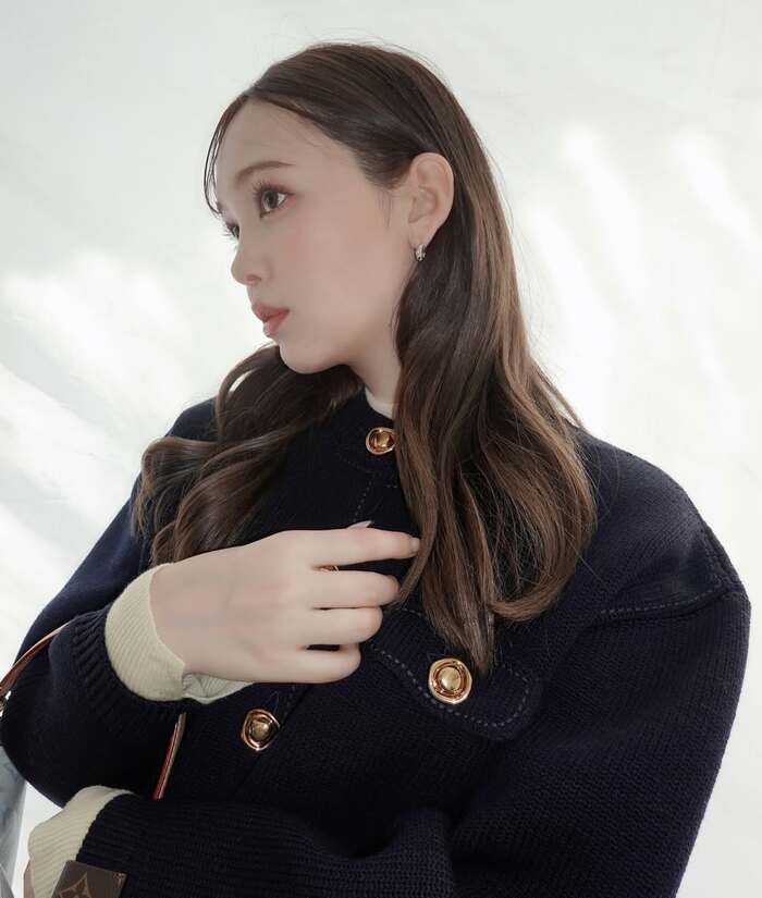 公開された写真には、淡いイエローのタートルネックに、金ボタンが印象的なネイビーのアウター、ワイドシルエットのボトムスを合わせた、洗練された大人の雰囲気が漂う藤田さんの姿が。裾からさりげなくのぞくレース素材が、かわいらしさをプラスしています。
