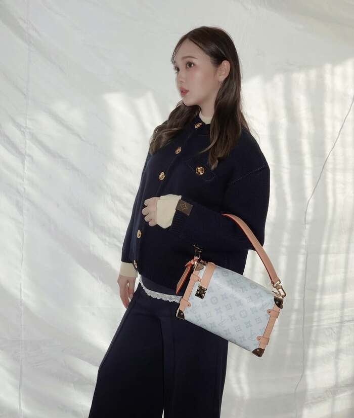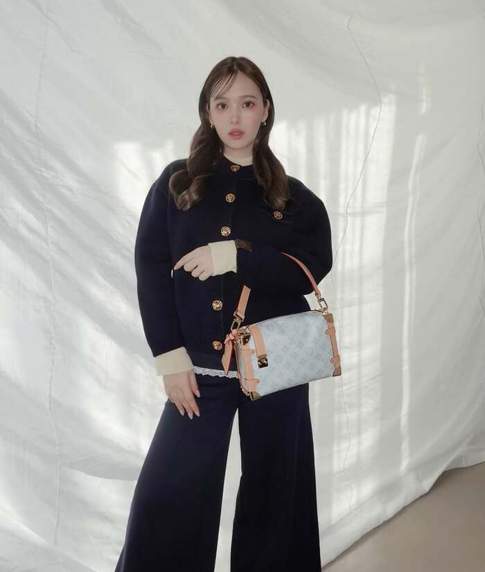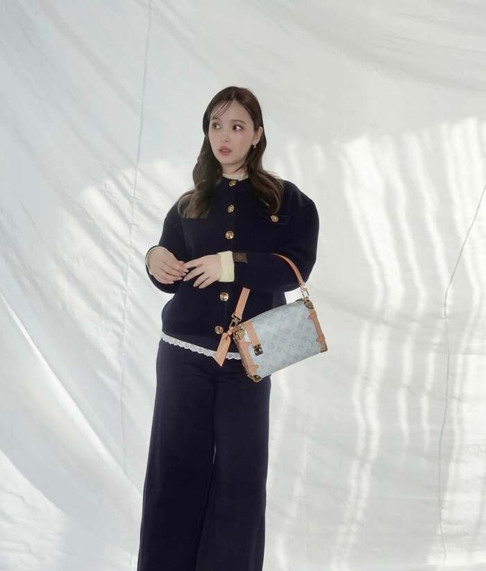 腕に掛けたルイ・ヴィトンのバッグは、ライトブルーのモノグラム柄で春らしい雰囲気を演出。澄ました表情でこちらを真っすぐ見つめる藤田さんの姿に、思わず見入ってしまいます。