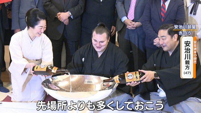 部屋に戻った安青錦を出迎えたのは、師匠の安治川親方。新大関として迎えた場所での優勝に、部屋は歓喜に包まれました。尊敬する親方、そして女将が注いでくれた勝利の美酒に、思わず笑みがこぼれます。