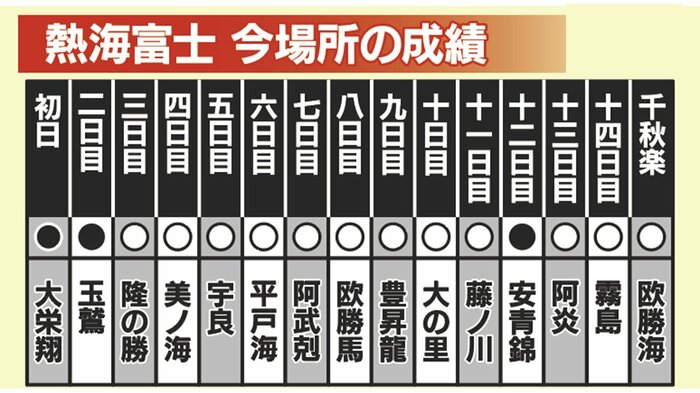 そんな安青錦と優勝を争ったのが前頭4枚目の熱海富士。今場所九日目と十日目、豊昇龍と大の里、横綱2人に2日続けて金星をあげています。