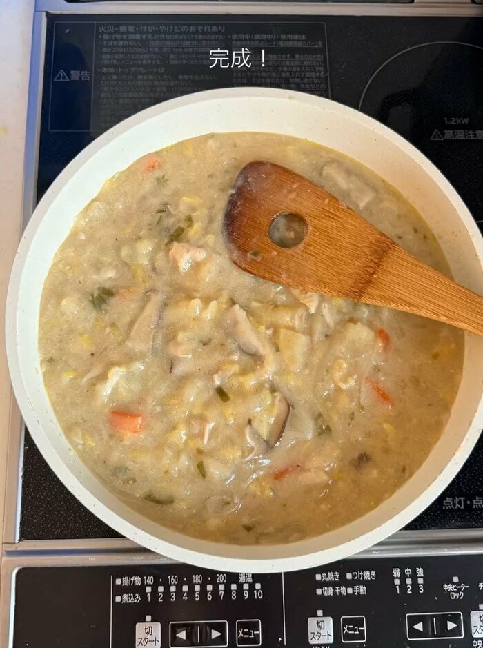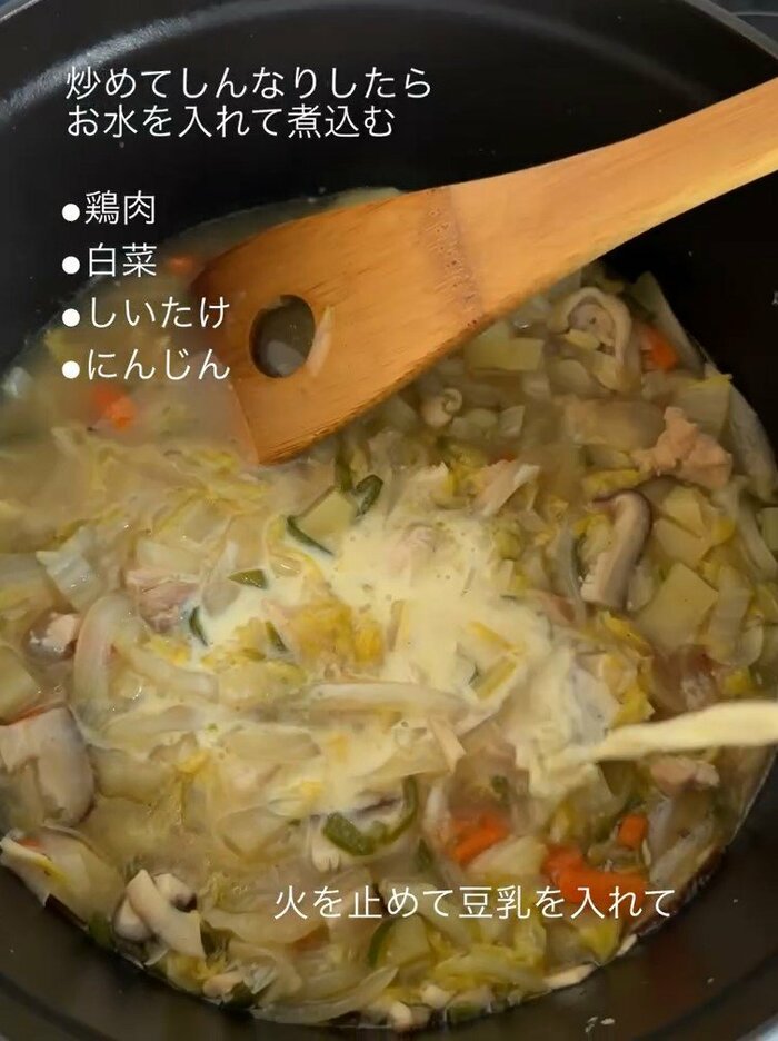鍋に先ほどの材料と鶏肉を入れて炒め、全体的にしんなりしてきたら水を入れて煮込みます。そして、途中で火を止めて豆乳を入れ、すりおろしたジャガイモを加えてとろみをつけます。