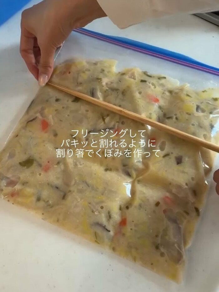 できあがったスープをフリーザーバッグに入れ、9等分になるように割りばしでくぼみを作ったら、フリージング食のできあがり!冷凍保存しておくと食べたいときにいつでも食べられ、くぼみを入れることで食べたい分だけパキッと割ることができるので、時短にもなりとても便利ですね。