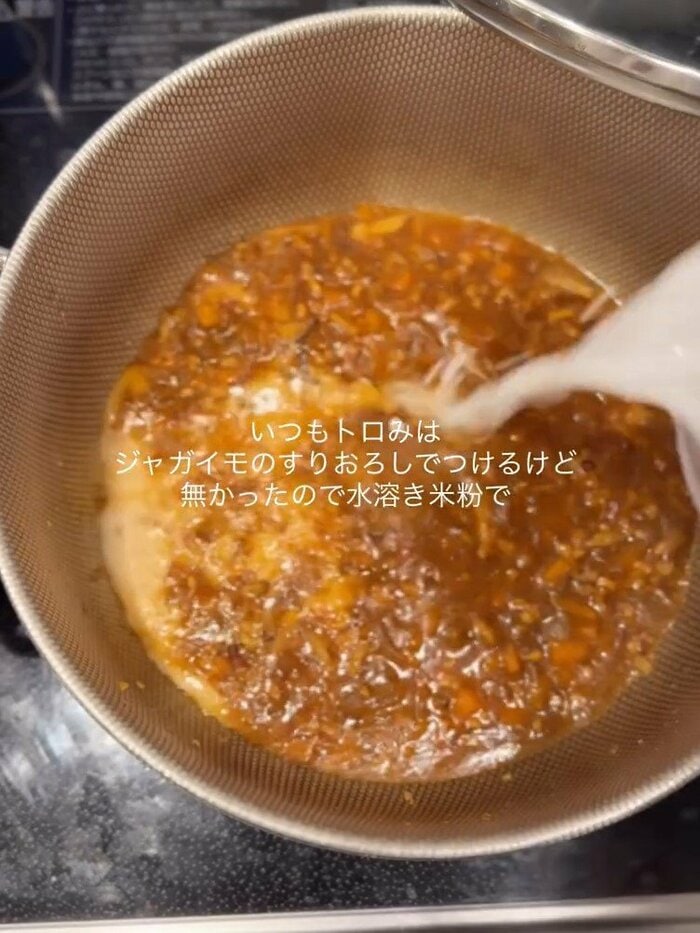 水溶き米粉を回し入れてとろみをプラス。普段はジャガイモのすりおろしを入れてとろみをつけているそうですが、この日は無かったようで、米粉で代用です!