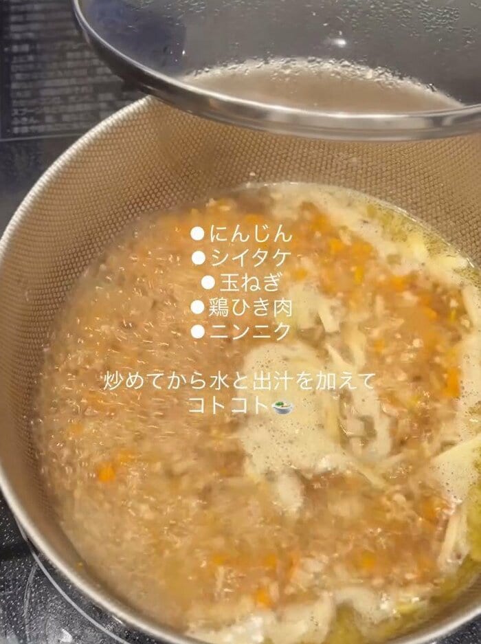 まずは、にんじん、シイタケ、タマネギ、鶏ひき肉、ニンニクを炒めた後に水とだしを入れて、コトコトと煮込みます。