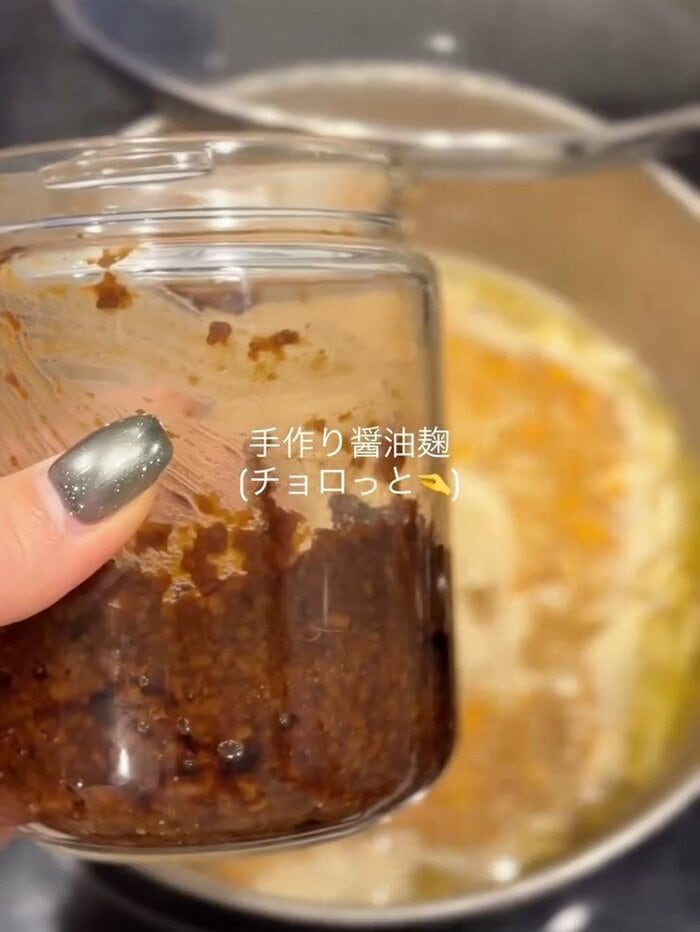 そこに、手作りのしょうゆこうじと手作りの味噌を少しずつ入れ、約7倍に濃縮したトマトペーストを入れます。