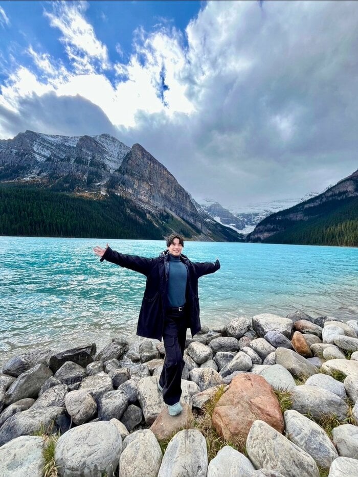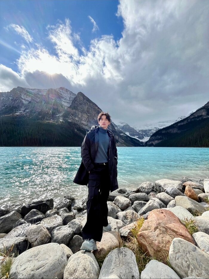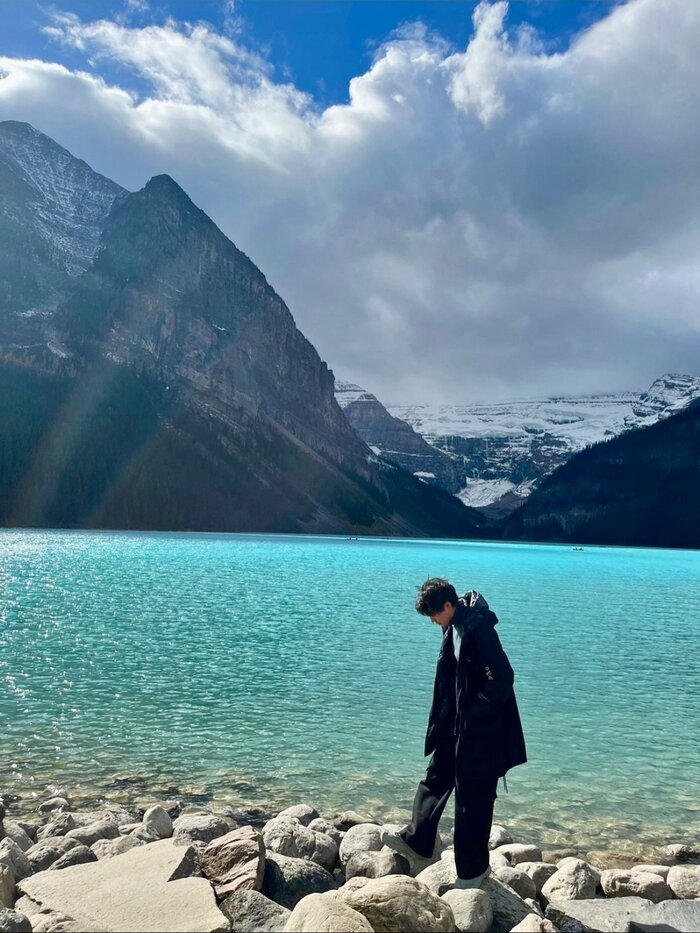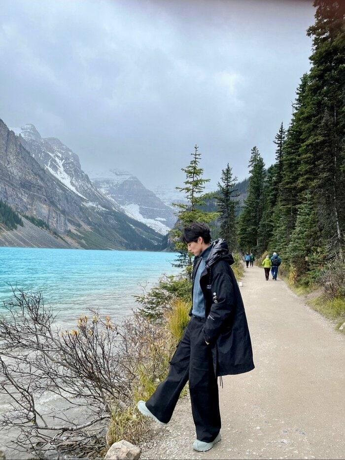 今回の投稿では「Canada, Banffにあるレイクルイースに行きました。撮影の合間に行くことができて、本当に綺麗でした!」とつづり、カナダでのオフショットを公開しています。
