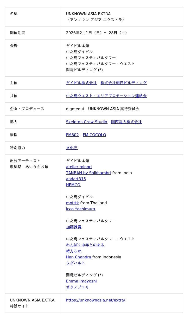 UNKNOWN ASIA実行委員会(大阪市北区)は、2026年2月1日(日)から28日(土)までの1ヶ月間、大阪・中之島エリアにてアートイベント「UNKNOWN ASIA EXTRA」を開催することを発表いたします。