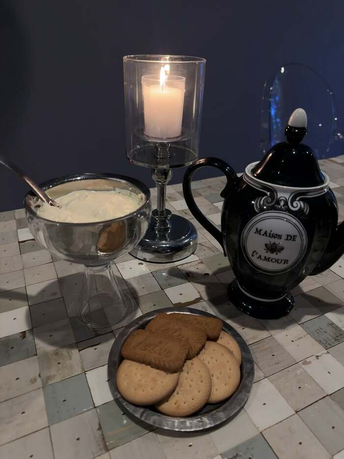 そして、高さのある深めの銀の器にたっぷり入っているのが、とろっと濃厚そうなレアチーズディップ♪ ビスケットを付けて食べたらとってもおいしそう♪
