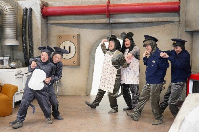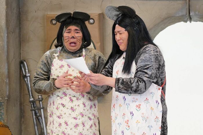 新作コント3本目に登場するのは、「キングオブコント2022」で歴代最高得点を獲得して優勝したビスケットブラザーズ。真夜中に部屋で大騒ぎしていたぴかりとたなチューに対して、近所のきんネズミの奥さん(きん)と、原田チューの奥さん(原田泰雅)が、結託して警察(シティホテル3号室)を呼んでクレームを入れることを決意。その後、姿を消してしまうぴかりとたなチューでしたが、そこからコントは意外な展開を迎えていきます。