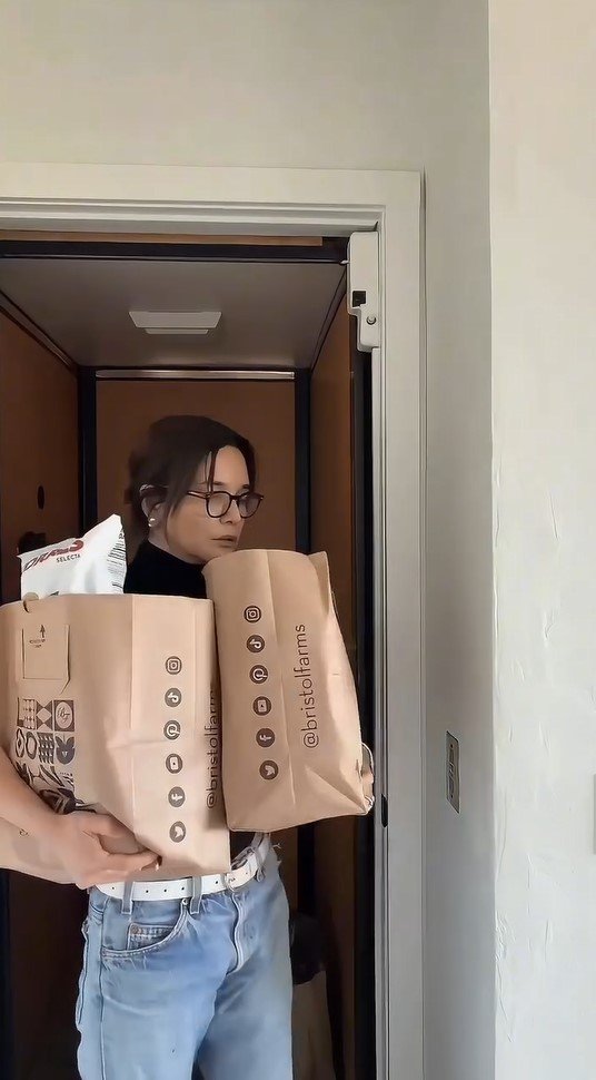 パンパンに入った重そうな紙袋を、2つ両脇に抱えて帰宅してきたところのようです。