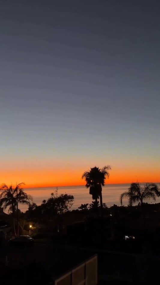 バルコニーに出ると、穏やかな海をバックにしたヤシの木のシルエットが浮かび上がり、さらに、青とオレンジのグラデーションが美しい空が映えていて素敵です。