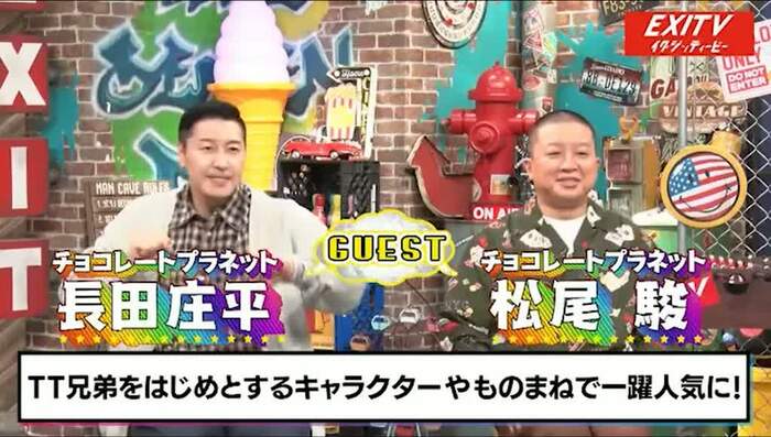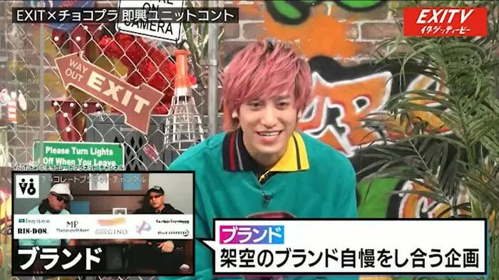 番組後半では、「EXIT×チョコレートプラネット 即興ユニットコント」コーナーを開催。チョコレートプラネットのYouTubeチャンネルでの人気企画「ブランド」(架空のブランド自慢をし合う企画)を、EXITにぴったりな「クラブ」設定でチャレンジすることに。
