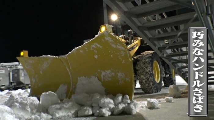 積もった雪を押し出すだけでなく、バックするときもショベルの裏側を利用して器用に雪かきをしていきます。さらに、周辺に転がった小さな雪玉も、巧みなハンドルさばきでかき集めていきます。