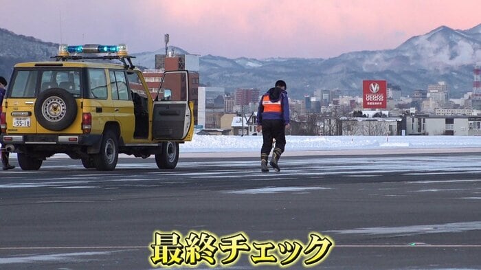 午前7時過ぎ、滑走路上では点検車両が落とし物や、除雪の最終チェックを行います。タイムリミットの7時半までに、なんとか除雪作業を無事終えることができました。