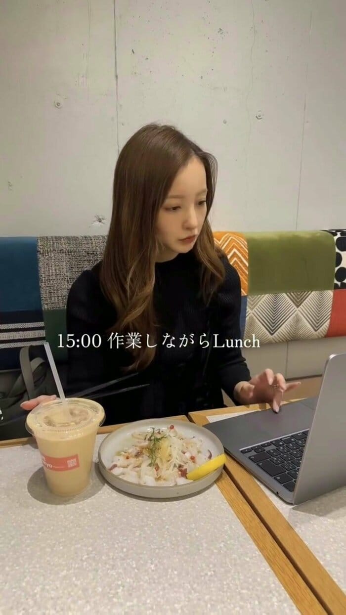 黒のキャップに黒のトップス姿で、ドリンクを片手にパソコンと向き合う板野さん。