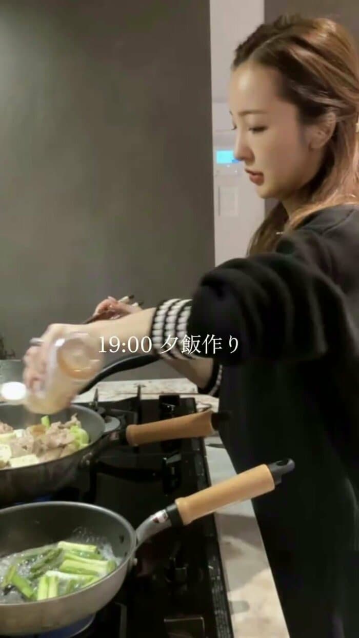 息つく間もなく、夕食作りに取りかかります。コンロに同時に火をかけ、手前のフライパンでは野菜、奥のフライパンでは肉を炒めるなど、あまりの手際の良さに驚かされます。