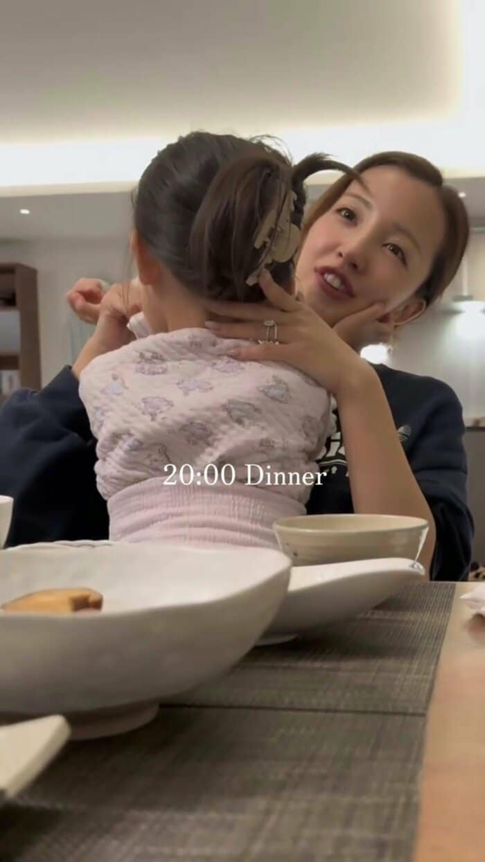 夕食を食べ終わった後は、ベビちんを膝の上に乗せ、少しだけまったりタイム。板野さんのほっぺに手を伸ばして甘える姿が、とても愛らしい一幕です。