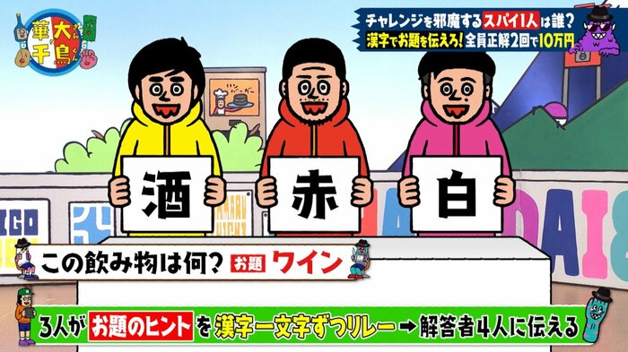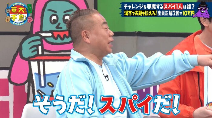 博多華丸(博多華丸・大吉)さん、千鳥(大悟さん、ノブさん)、かまいたち(山内健司さん、濱家隆一さん)を含めた7人のうち1人は、事前にくじ引きで決定した“スパイ”で、ほかのメンバーにバレないようにゲームを失敗させようとします。