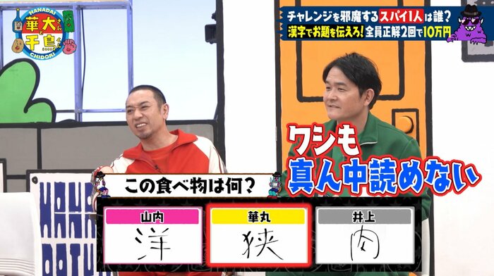 ほかにも、お題「タクシー」(ヒントは「光」「車」「金」)で「新幹線」と答えた井上さんや、お題「ペンギン」(ヒントは「水」「鳥」「黒」)で「カラス」と答えた華丸さんにも、疑いの目が向けられました。