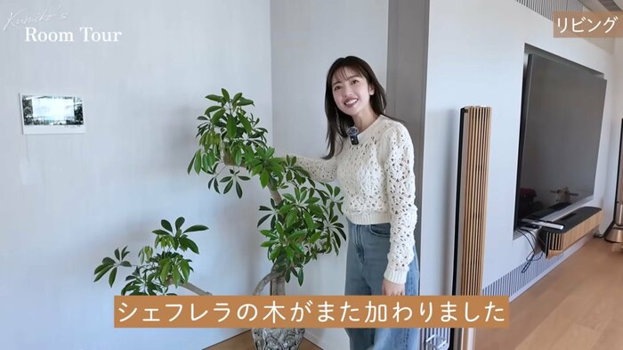 キッチンからリビングへ進むと、壁には大画面のテレビが設置してあり、そばには大きなシェフレラの木が置かれています。舟山さんが一目ぼれして最近購入したそうで、日々の癒やしとなっていると愛情たっぷりに明かしました。
