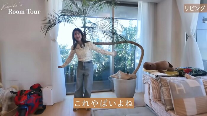 さらに、窓際には天井ほどの高さの大きなヤシの木も。夫が一目ぼれしたというこの木は、幹が途中できゅっと曲がったデザインとなっています。