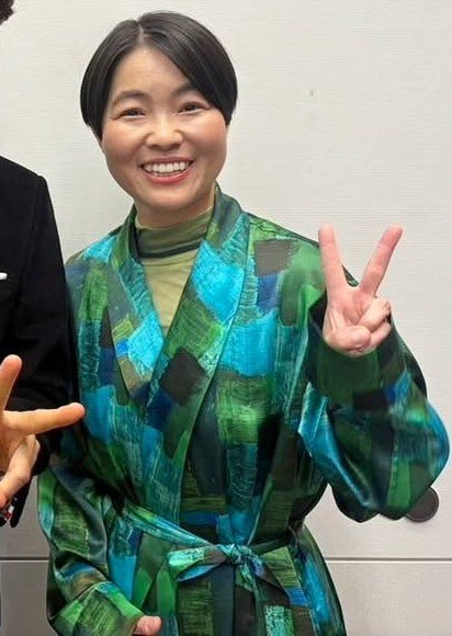 緑色をベースに無造作に水色や深緑色などが上から足されたようなデザインのガウンコートを羽織ったイモトさんは、カメラに向かって満面の笑みを浮かべながら片手でピースサインをしていて、どこかうれしそうな様子。