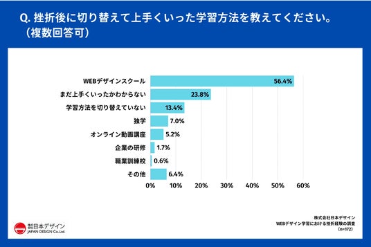 「Q.挫折後に切り替えて上手くいった学習方法を教えてください。(複数回答可)」(n=172)と質問したところ、「WEBデザインスクール」が56.4%で最多となりました。
