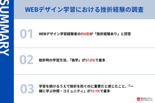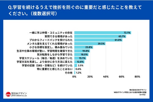 一方、挫折後にうまくいった学習方法は「WEBデザインスクール」(56.4%)が最多となり、挫折を防ぐ鍵としても「一緒に学ぶ仲間・コミュニティ」(72.1%)、「質問できる環境」(65.7%)、「プロからのフィードバック」(61.0%)が上位を占めました。