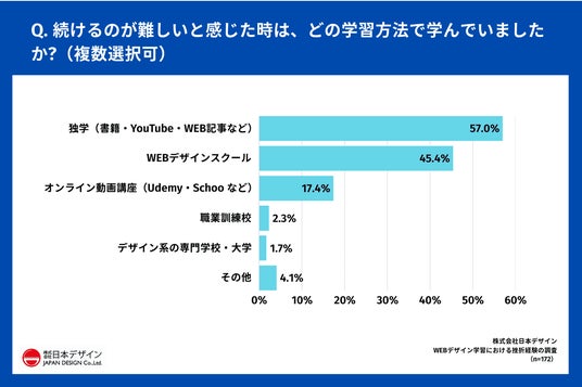 挫折経験がある方に「Q.続けるのが難しいと感じた時は、どの学習方法で学んでいましたか?(複数選択可)」(n=172)と質問したところ、「独学(書籍・YouTube・WEB記事など)」が57.0%で最多となりました。