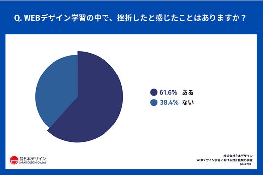 「Q.WEBデザイン学習の中で、挫折したと感じたことはありますか?」(n=279)と質問したところ、「ある(挫折経験あり)」が61.6%となり、約6割が挫折を経験していることがわかりました。