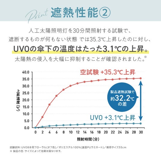 人工太陽照明灯を30分間照射する試験で、遮断するものが何もない状態で測定した熱線受光体の温度は35.3℃上昇したのに対し、UVO傘下に設置した熱線受光体の温度はたった3.1℃の上昇に留まり、太陽熱の侵入を大幅に抑制することが確認できました。