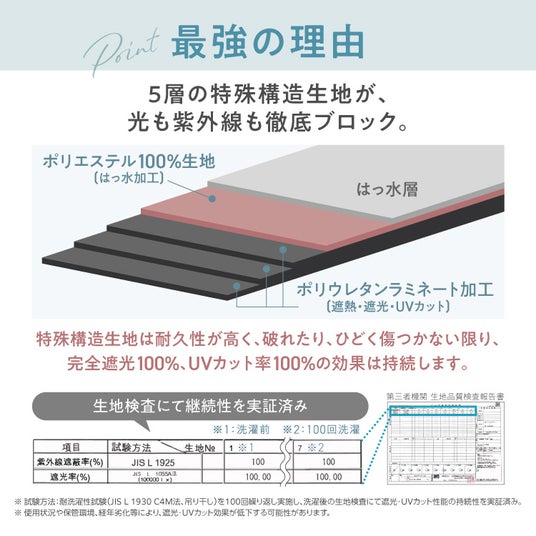 ※3 完全遮光100%:JIS L 1055 A法にて遮光率100%の測定値が出た生地を遮光率100%生地としております。