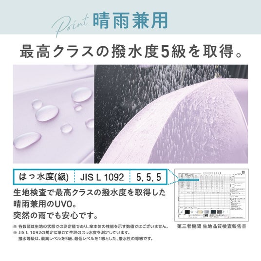 UVOは、生地表面に施した加工により撥水度は最高等級5級※6を取得。雨傘と同等の撥水性を備えています。急な豪雨も、天候にかかわらず降り注ぐ紫外線もしっかりブロックします。