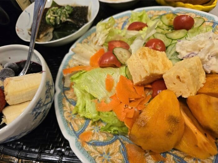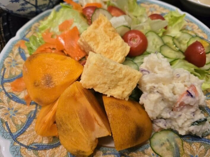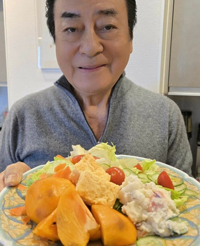 公開された写真には、花柄の大皿にレタスやきゅうり、ミニトマト、にんじんといった色とりどりの野菜サラダが盛られています。そこにふんわりとした卵焼きやポテトサラダ、さらには柿がゴロッと添えられ、「今朝は玉子やき ポテトサラダ 横溝柿などのデカ盛り野菜サラダ」と和洋折衷のデカ盛りサラダを紹介しました。