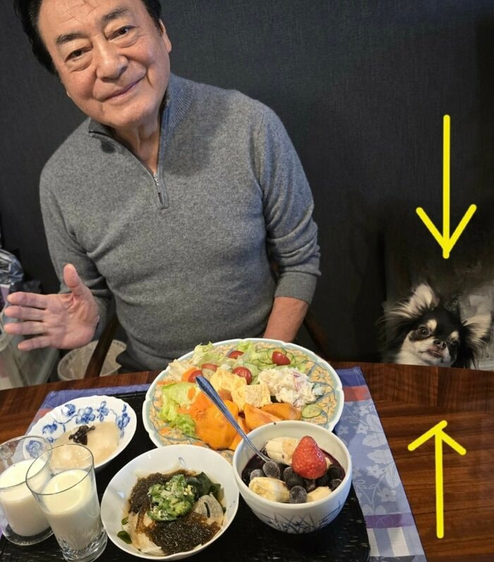 「青豆豆乳もあって盛り沢山 プッチも覗き見をしています」と、灰色のジップアップを着た高橋さんが食卓を前に穏やかに微笑むショットでは、テーブルの下からひょっこりと顔を覗かせる愛犬・プッチの姿も披露しました。