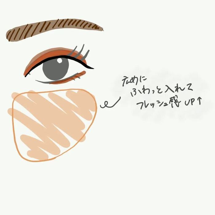 目元はオレンジブラウンに仕上げる。ポイントは「オレンジ」ではなく「オレンジブラウン」だということ!「オレンジ一色のグラデーションだけで終わりにしてしまうと、どうしても腫れぼったい印象のまぶたになっちゃいますよ!」とのこと。詳しい描き方とは?