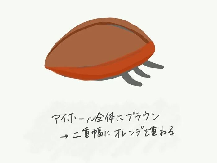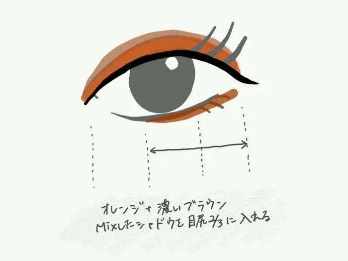 まずはアイホール全体にブラウンのシャドウを薄くのせ、オレンジのシャドウを二重幅だけに重ねる。ブラウンのような暗い色にオレンジを重ねることで、オレンジが派手すぎず、落ち着いた色味に仕上がるそう。