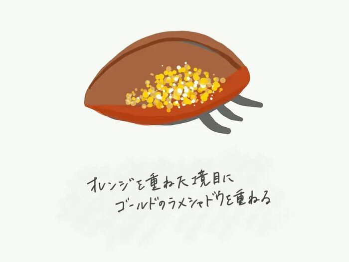「これだけでもすでにオシャレだけど、大人っぽいきらめきが欲しいので、ゴールドのラメ入りシャドウを重ねます。」と林さん。ポイントは重ねる場所!【オレンジシャドウの境目】に入れることで、主張しすぎず、目をつぶったときにキラッとする「大人のきらめき」が加わるそう。これぞプロのテクニック。