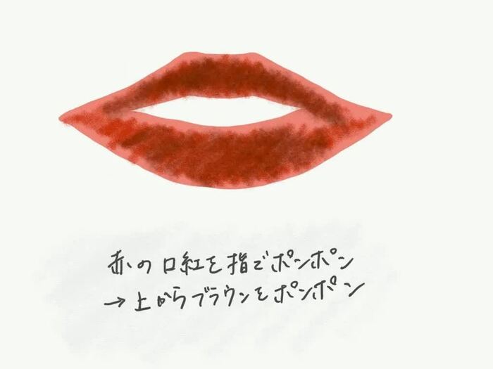 リップは明るい色と暗い色の2色重ね。まずは明るい色・赤を気持ちしっかりめにのせていく。顔全体のバランスを考え、目元がくっきりしている分、リップは指でポンポンとラフに塗り、あえて輪郭は取らないようにするのが大事らしい。