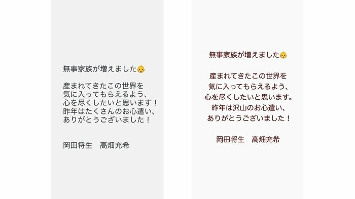 文字の色を変えるなど多少違いはありますが、文面を合わせていたり、同じ場所でおそろいの“赤ちゃん”絵文字が使われていることから、内容をふたりで話し合いながら決めた“共同作業”の様子が伺えますね。我が子を思った温かみのある言葉が素敵で、思わずほっこりしてしまいます。