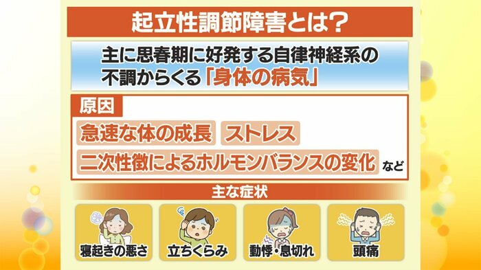 自律神経の乱れによって、立ちくらみやめまいを引き起こし、朝起きることが困難になるなどの症状が出る「起立性調節障害」。