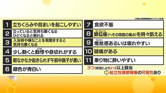 「起立性調節障害」の診療や保護者への相談にあたっている、昭和医科大学の小児科専門医・田中大介教授によると、以下のような症状に3つ以上当てはまる、ないし2つであっても症状が強く出た場合、起立性調節障害の疑いがあるといいます。