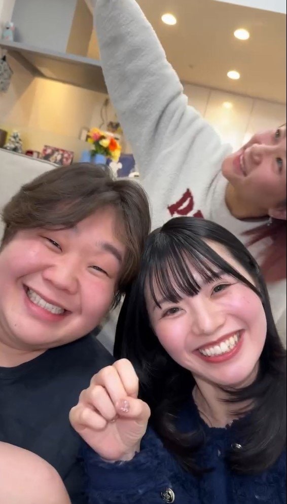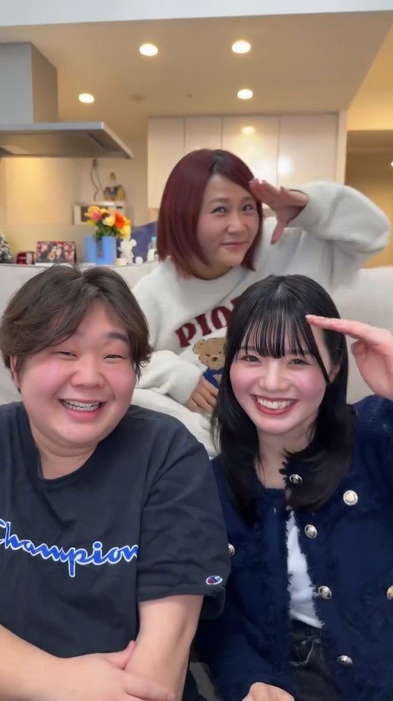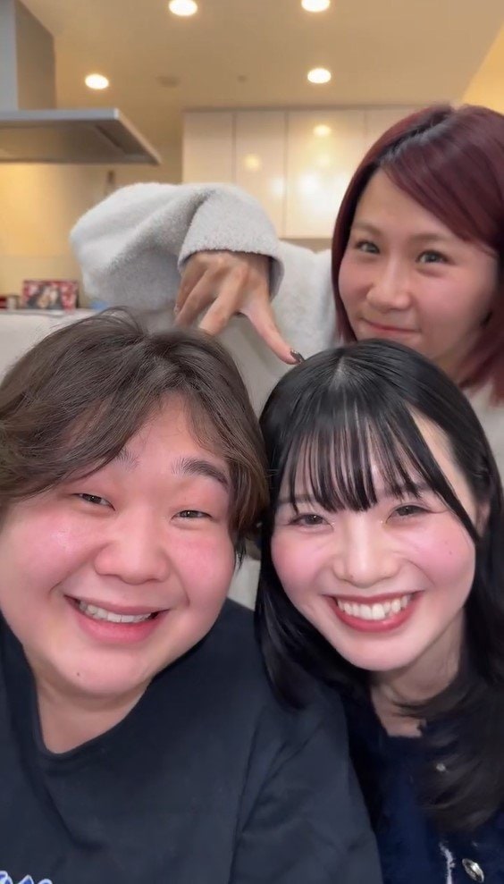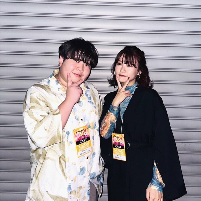 後ろには相方のいちえさんが2人の頭の上でピースサインを作っていて、どこかうれしそうです。