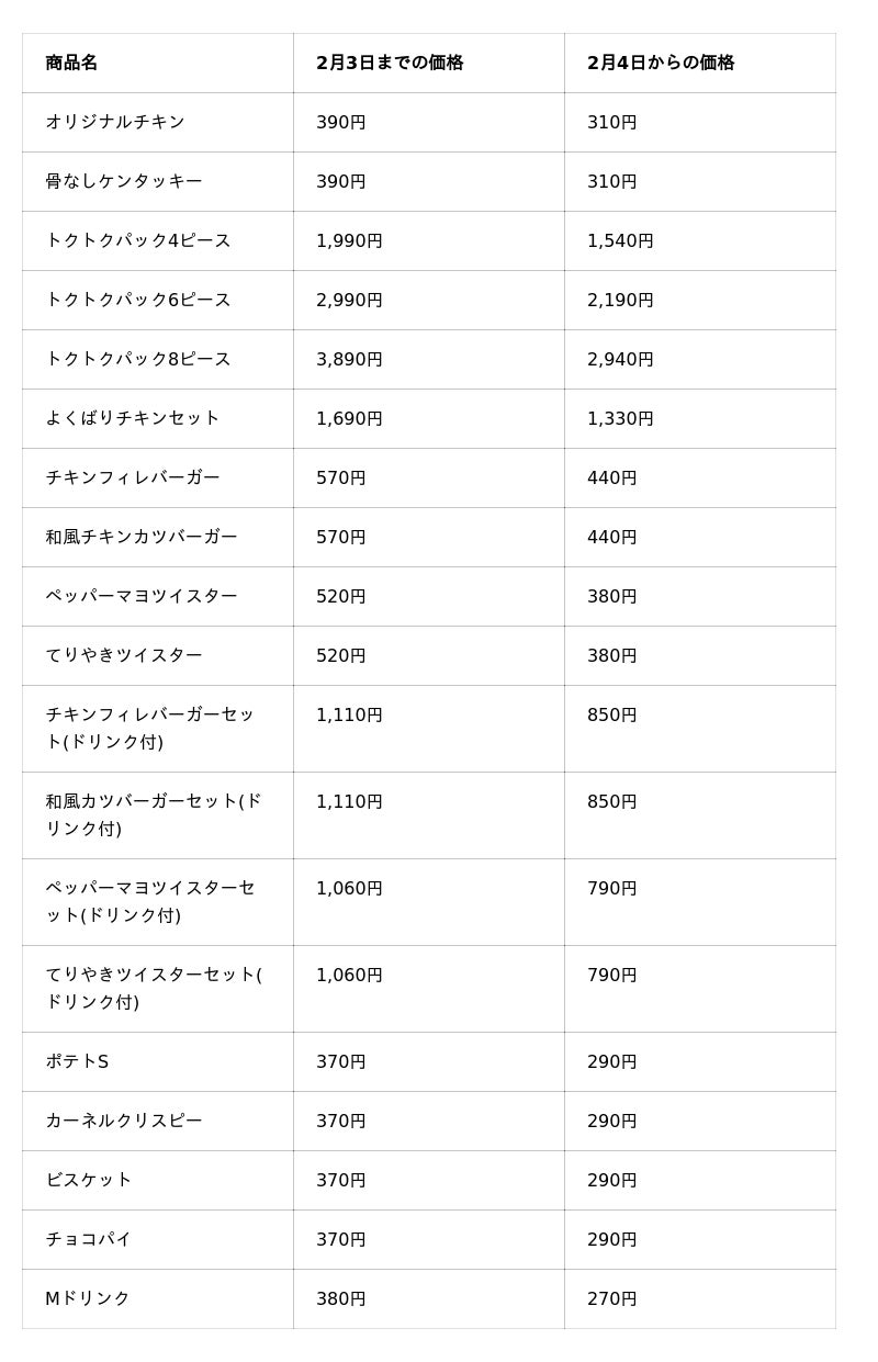 日本ケンタッキー・フライド・チキン株式会社(社長:遠藤 久、本社:神奈川県横浜市、以下:日本KFC)は、全国のケンタッキーフライドチキン(以下:KFC)店舗で、KFCデリバリーのメニュー販売価格を、2月4日(水)から店頭価格と同一に改定いたします。あわせて、これまで設定していた最低注文金額を撤廃し、ご注文いただけるメニューのラインナップも拡充します。