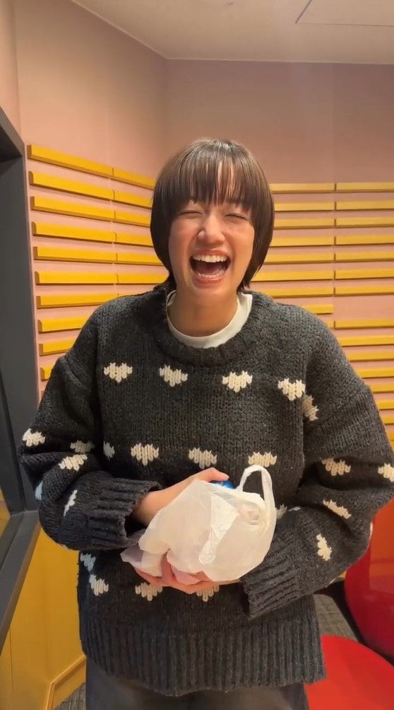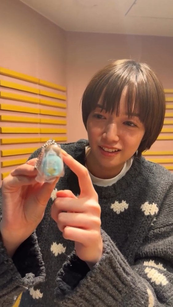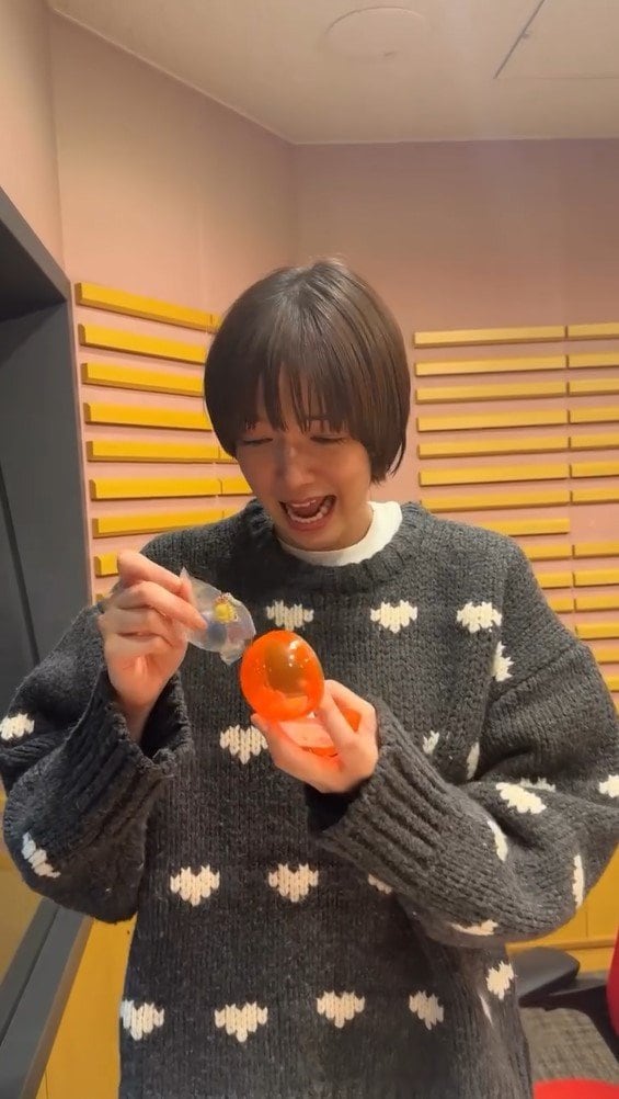 そこには、小さな白のハートの絵文字が描かれたグレーのニット姿の佐藤さんが、袋に入ったカプセルトイを持って満面の笑みを見せています!