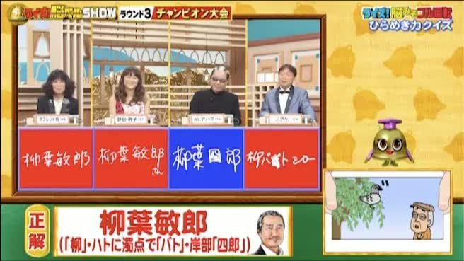 正解は「柳葉敏郎(柳+ハトに濁点+四郎)」。タブレットさん、野田さん、こぼんさんが正解!