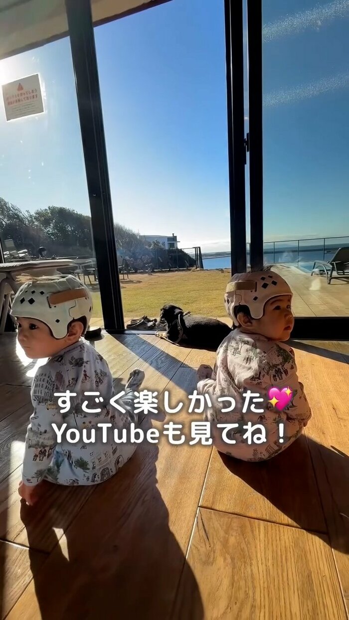 旅の終わりには、温かな日差しが差し込むオーシャンビューの部屋にペタッと座り込む双子たちの姿と共に「すごく楽しかった YouTubeも見てね!」とメッセージ。